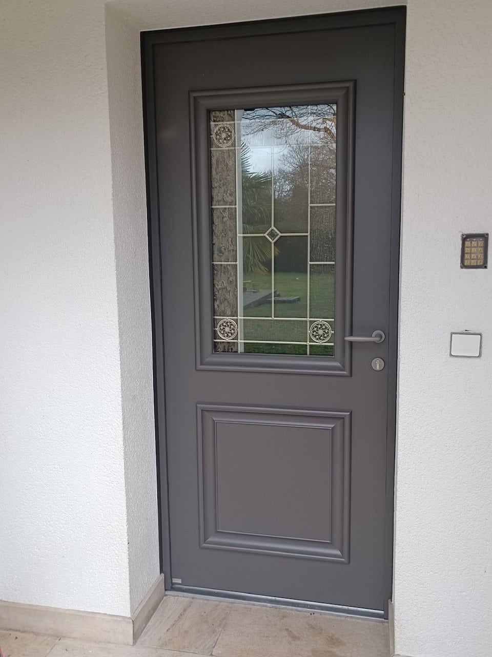 - Porte d’entrée de type Bel’m, gamme Aluminium 80, modèle Akimel, coloris gris 2900, serrure automatique 5 points à crochets, barillet de sécurité