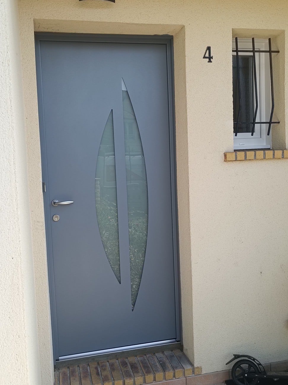 - Porte d’entrée aluminium de type Belm, gamme 60, modèle SELENE, bi coloration extérieur gris 2400, interieur blanc 9016, serrure 5pts à crochets, barillet de sécurité