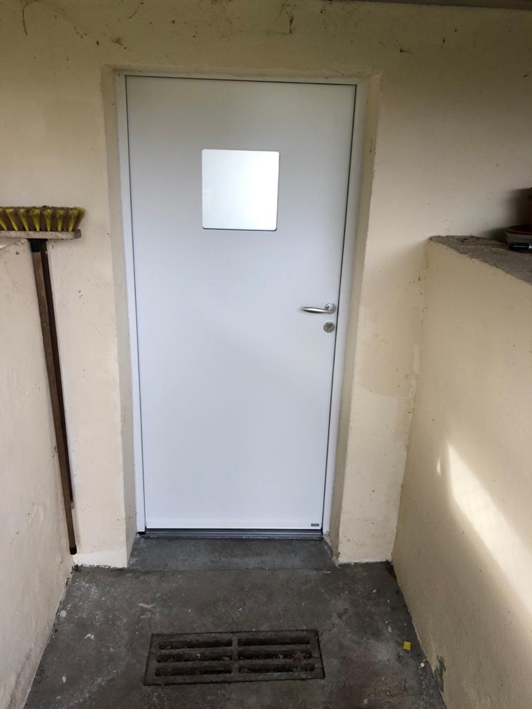 • Portre de service acier de type BELM, gamme 48, modèle PSA EVO 5, coloris blanc, dormant à rupture de pont thermique, seuil aluminium et serrure 5 points.