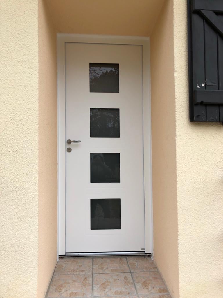 • Porte entrée aluminium de type BELM, , modèle MARSA, coloris blanc satiné (RAL 9016), triple vitrage thermique renforcé retardataire d’effraction, serrure 5 points à crochets, seuil PMR.