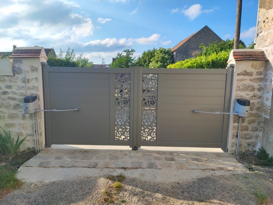 Portail aluminium de type Kostum by Cadiou, Gamme Fresk, base Cado, coloris gris (RAL 7045), motorisation à bras NICE