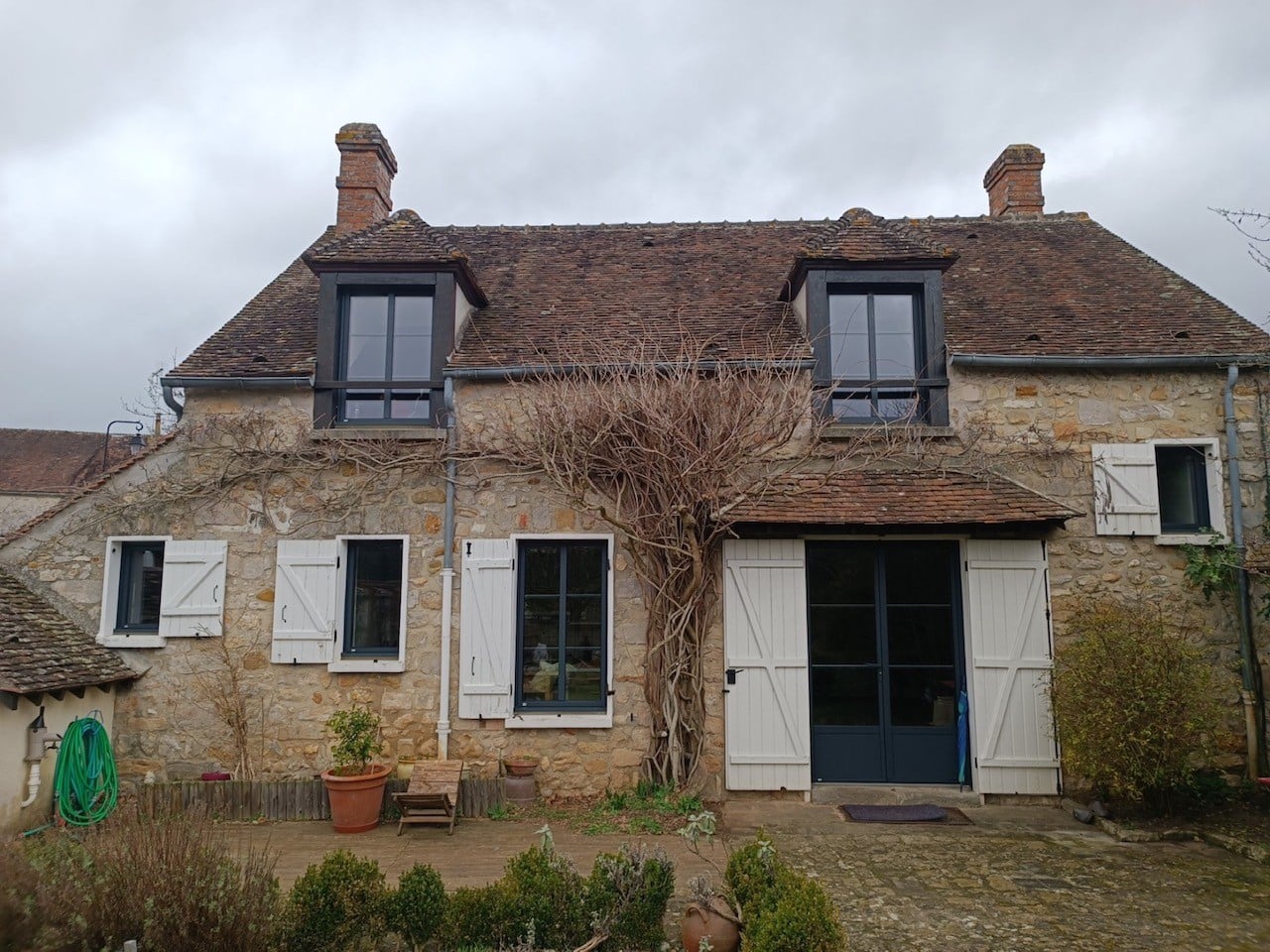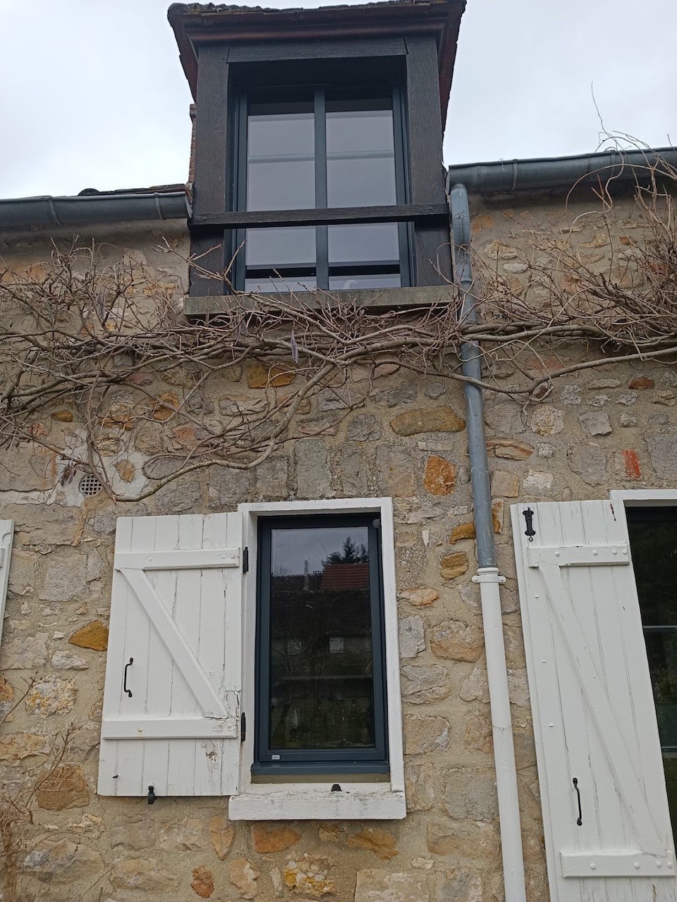 - Fenêtres et portes fenêtres aluminium de type Millet, gamme Simple dormant visible, coloris gris anthracite (RAL 7016), petits bois horizontaux incorporés